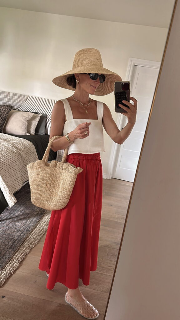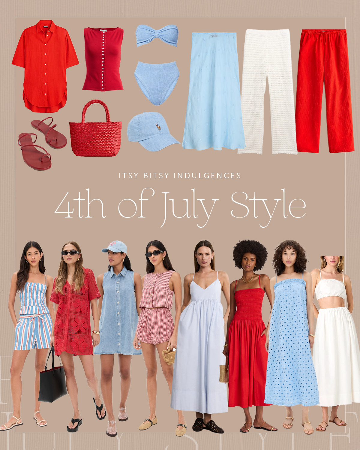 (Red Gauze Top | Red Button Down Top | Red Sandals | Red Woven Bag | Blue Two Piece | Chambray Cap | Blue Eyelet Coverup Skirt | White Knit Pants | Red Gauze Pants | Blue and White Shorts + Top | Red Crochet Coverup | Chambray Dress | Red + White Striped Shorts + Top | Blue Dress | Red Dress | Blue Eyelet Dress | White Two Piece Top + Skirt)