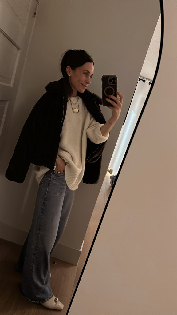(Back up to Santa Barbara with my entire family to celebrate my birthday and NYE… ivory jeans, sweater, brown faux fur jacket, flats, leggings, black jacket borrowed from TJ)