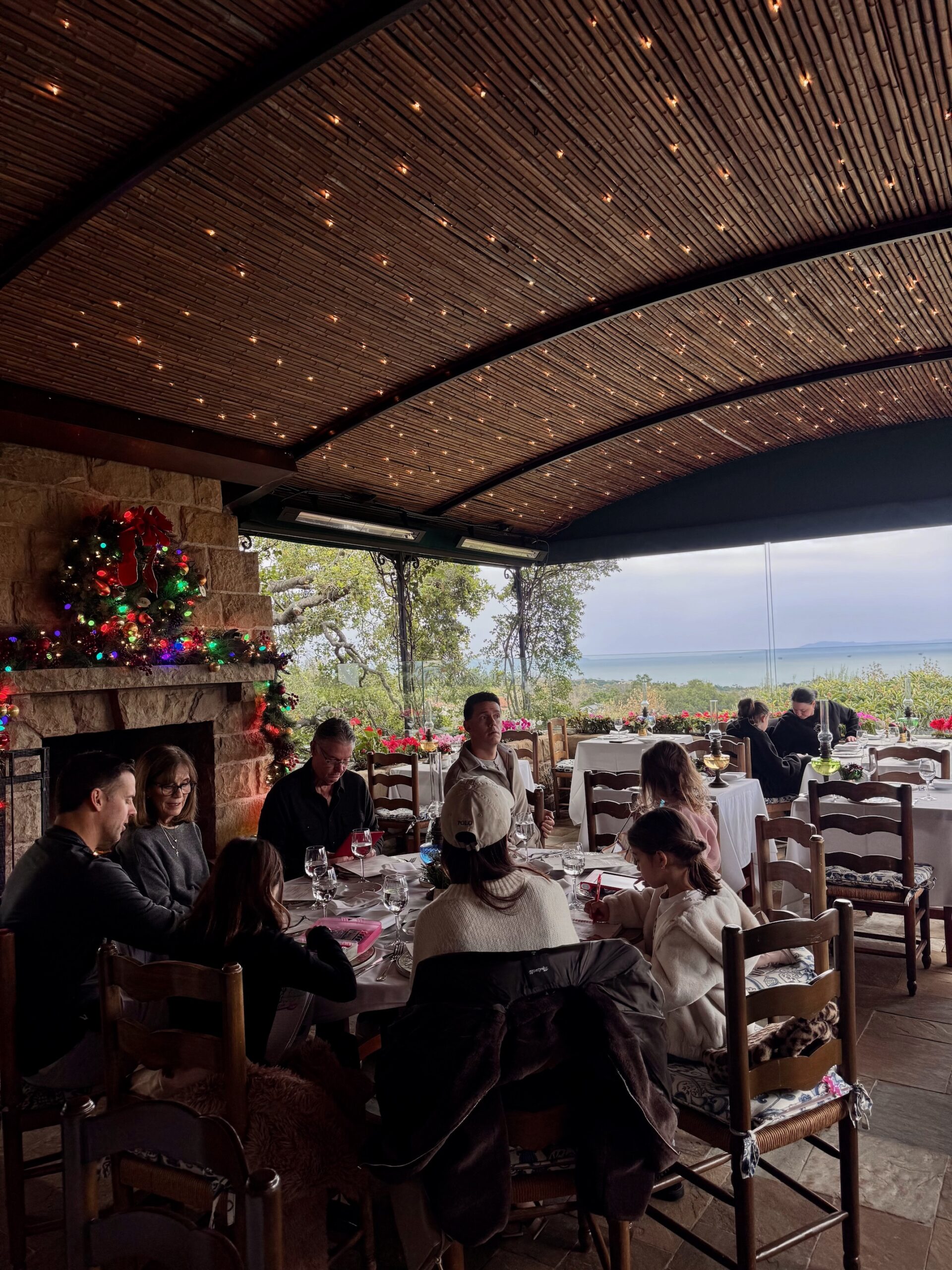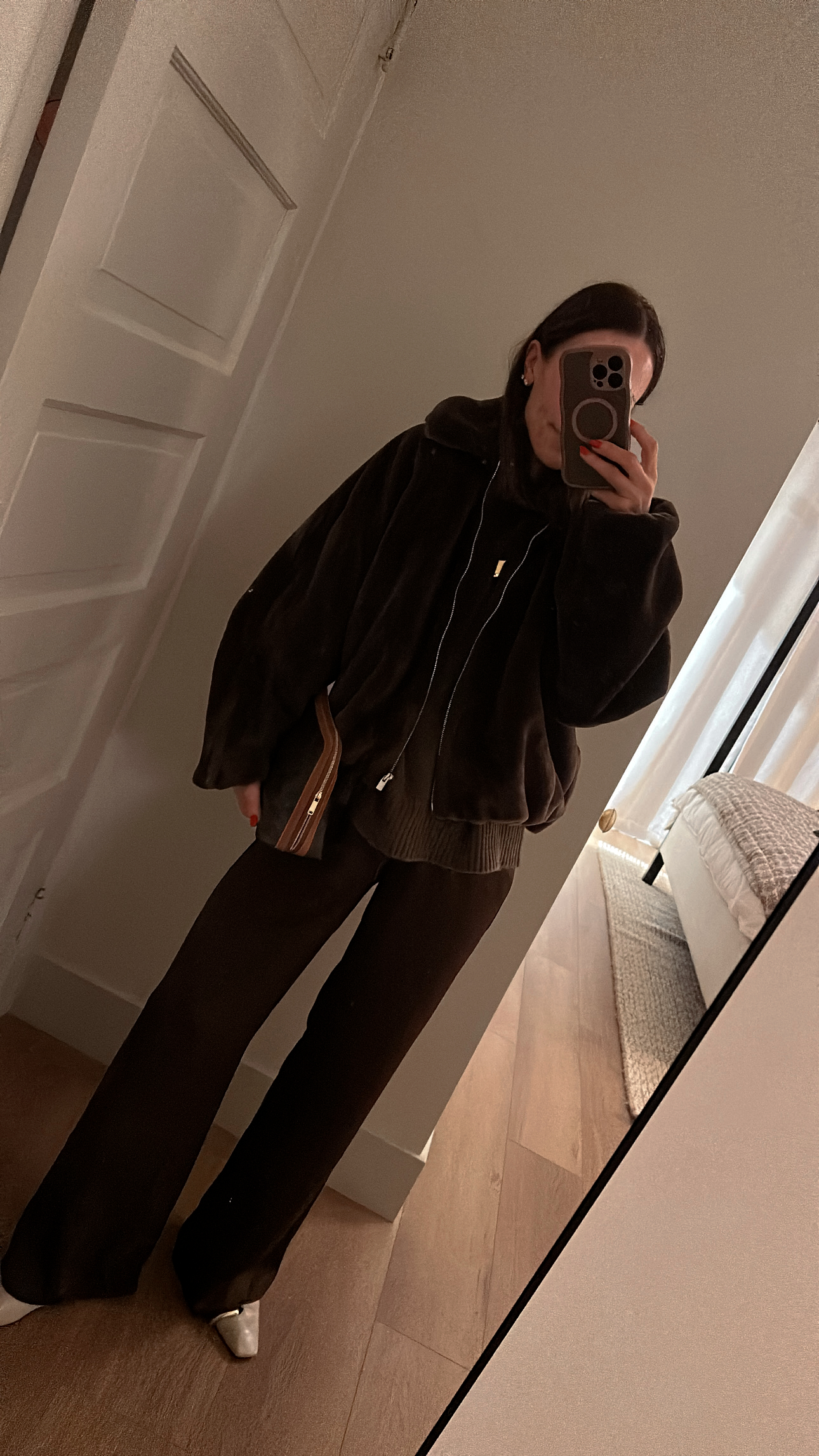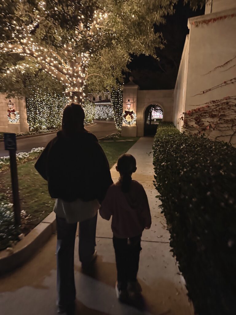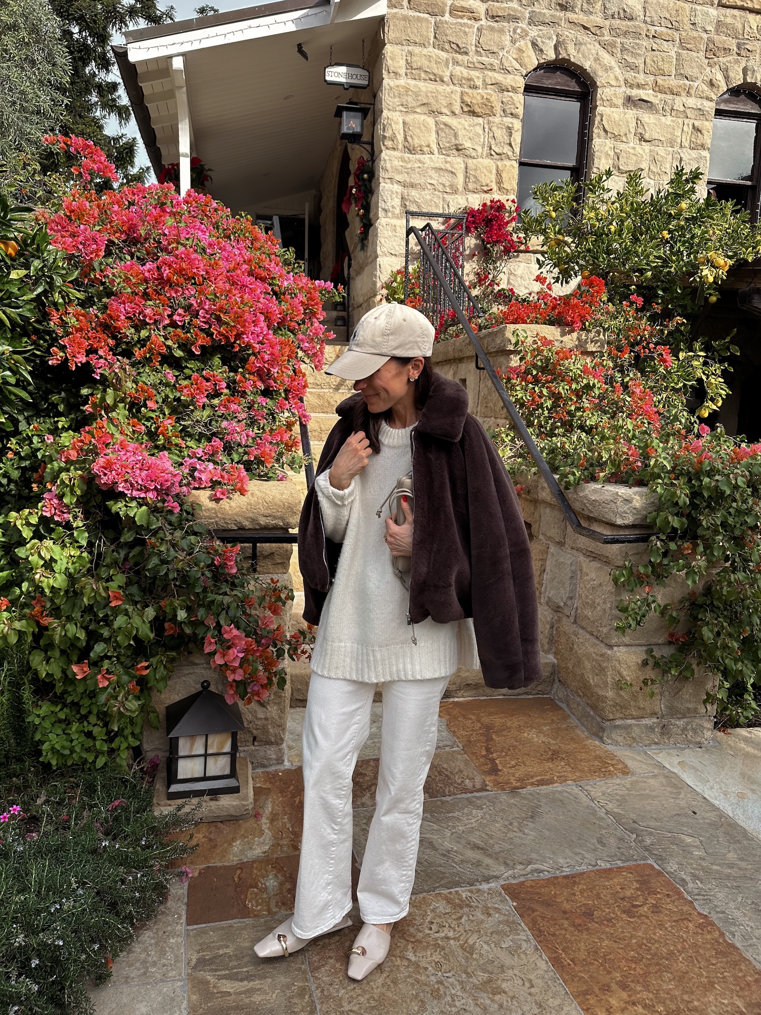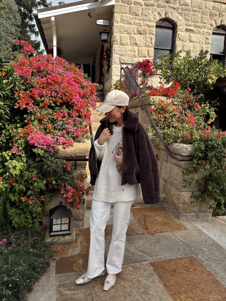 (Headed up to Santa Barbara the day the girls got out on break to put the finishing touches on The Bungalow…. enjoyed the decorations and unplugging… jeans, white sweater, brown faux fur bomber jacket, leggings, jacket, sweatshirt, brown satin pants (identical option), brown sweater, ivory flats, gold necklace)