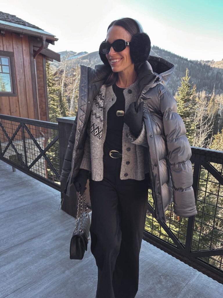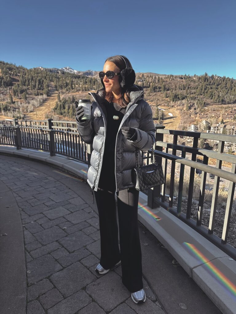 I purchased this liquid shine puffer coat for our Park City trip last year and brought it this trip as well (it’s 10% off) and it keeps me so warm (even in the snow last year, when it was 25 degree temps). I was able to layer a base and sweater underneath.