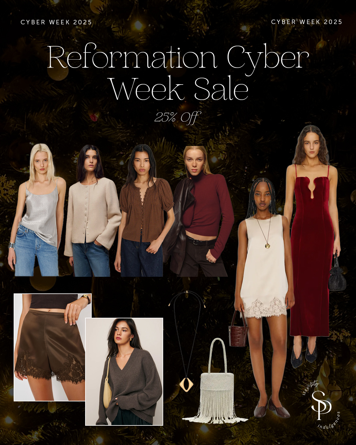 (Silver Cami | Wool Coat | Brown Check Top | Pinot Turtleneck | Lace Dress | Velvet Red Dress | Brown Lace Shorts | V-Neck Sweater | Gold Necklace | Beaded Bag (bought this and it’s beautiful))