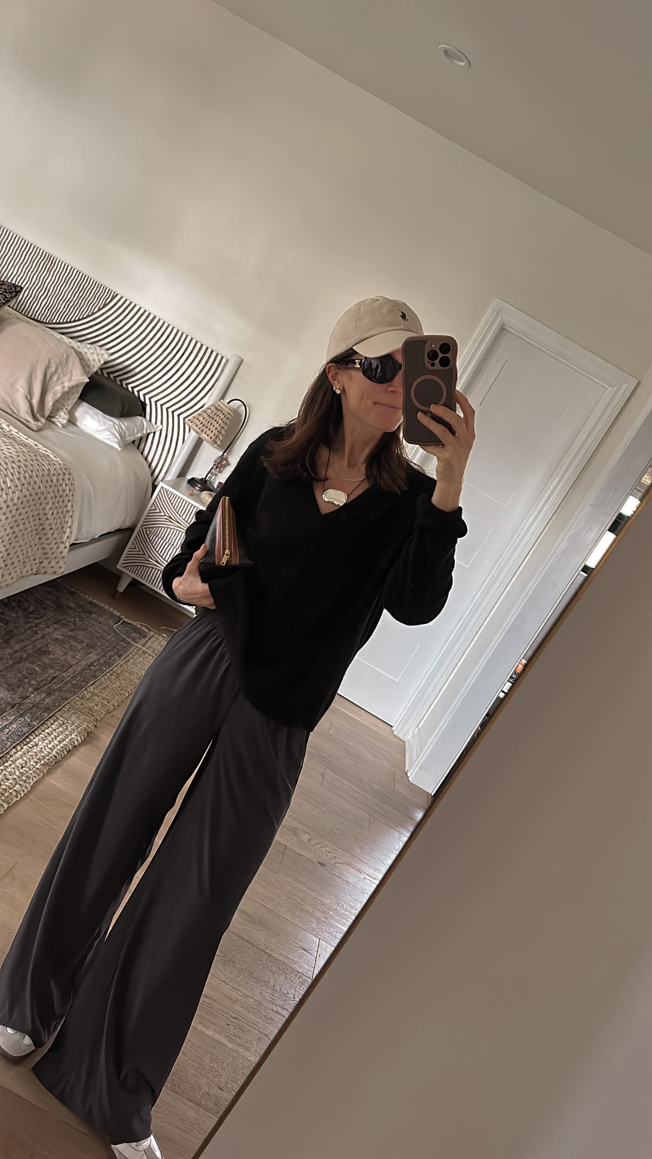 DAY 21: Casual Black Pants, V-Neck Sweater, Trench Coat (if needed), Gold Accessories, Cap, Sambas