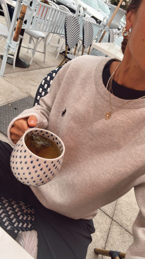 (Quick breakfast at a fav spot before heading home… sweatshirt, pants)