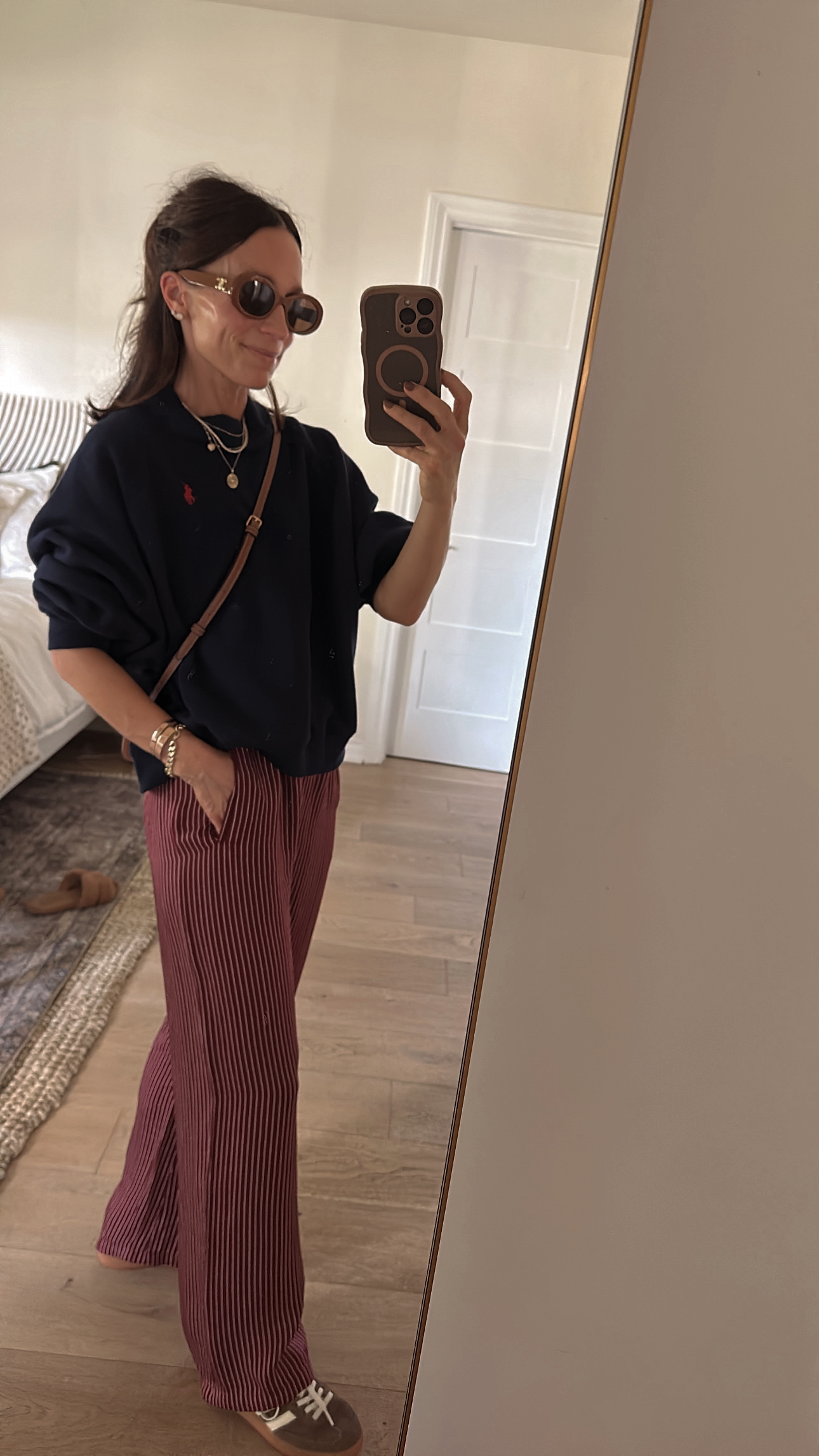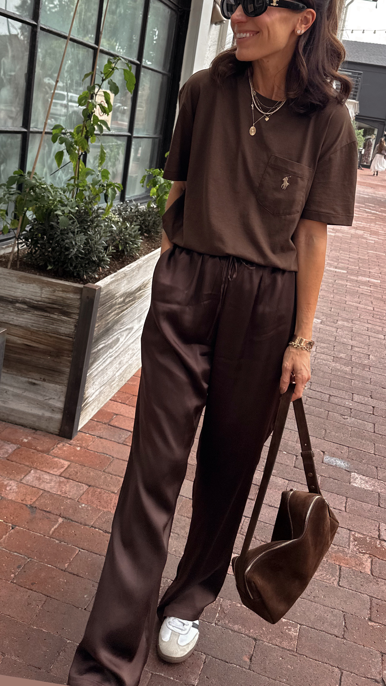 (Festive Friday breakfast-lunch in chocolate brown… pants, tee, sneakers, bag)