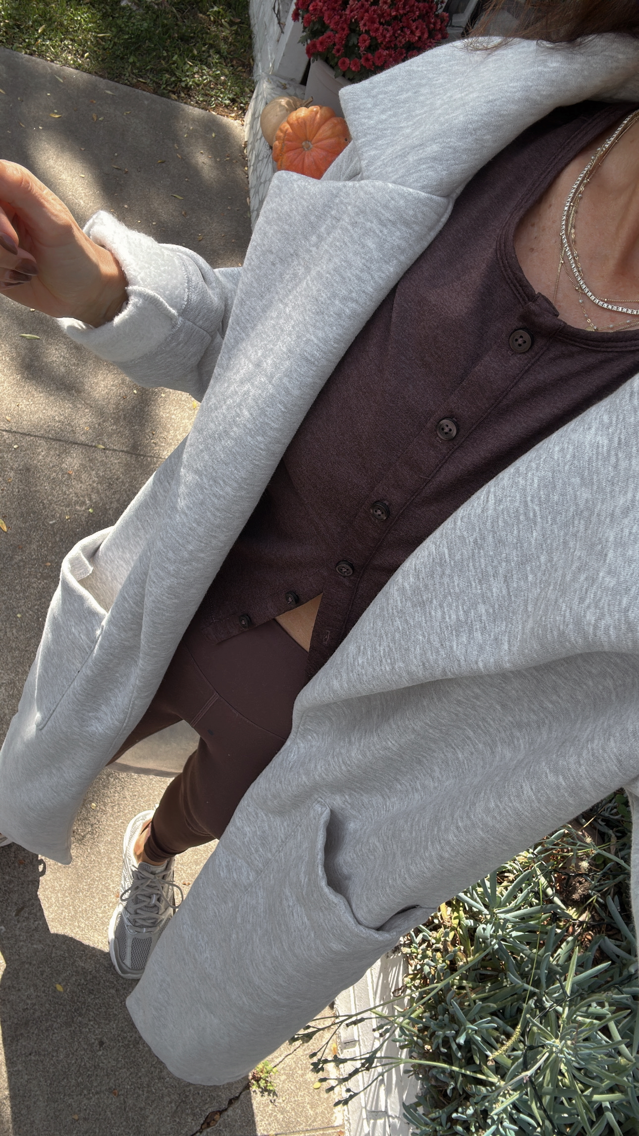 (Morning walk to a casual family lunch…. sweatshirt trench, top, leggings)