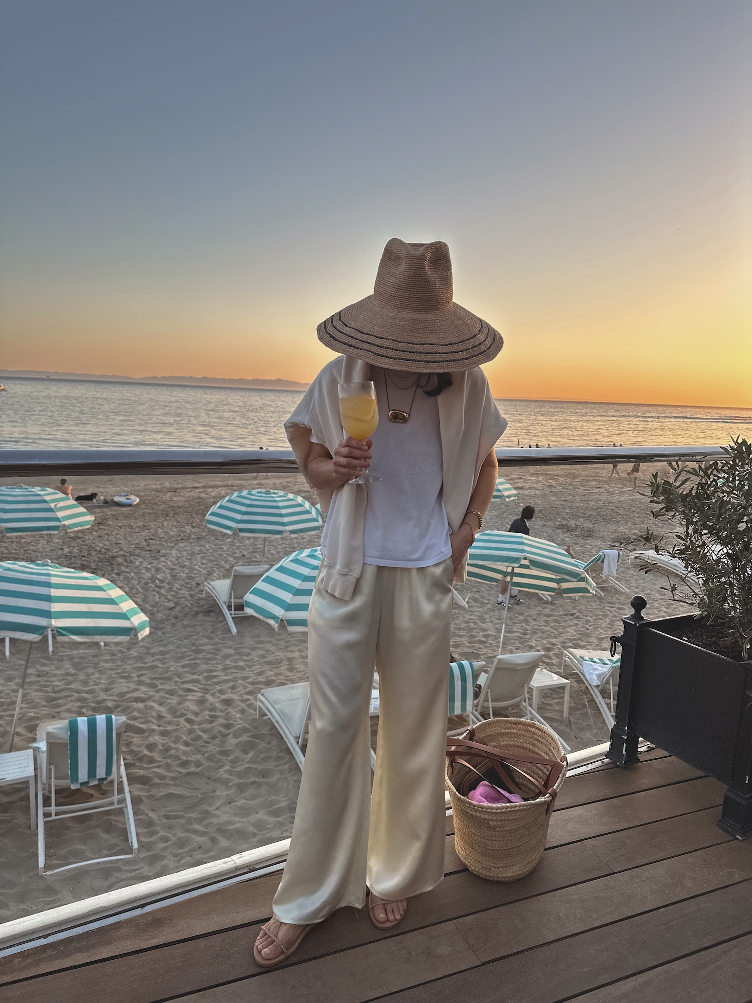 (Sunset cocktails at Miramar Beach…. satin pants, tee, sweatshirt, hat, necklace)