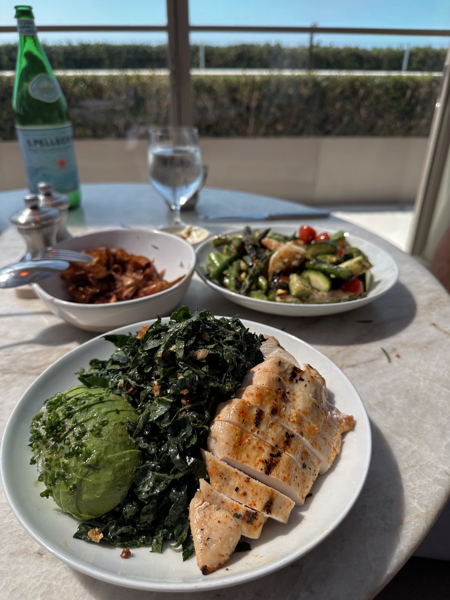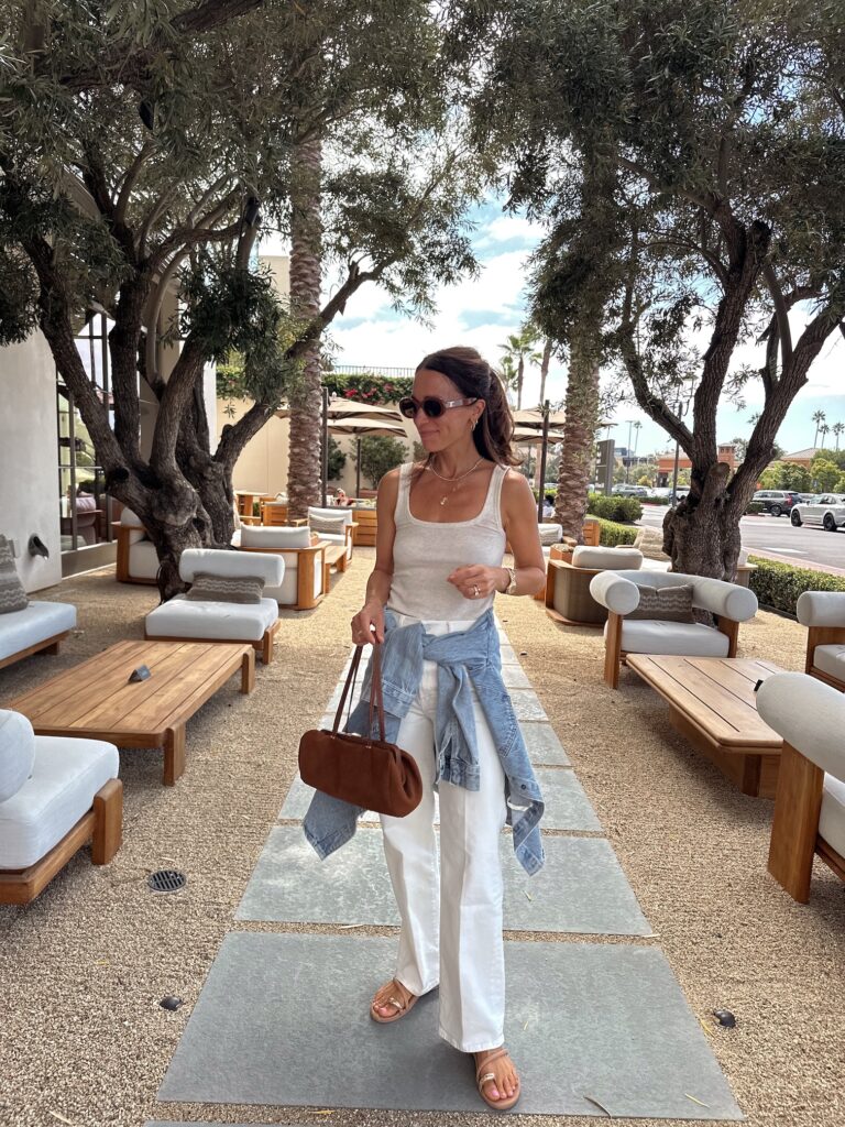 (Restoration Hardware for their delicious Caesar salad… jeans, tank, jacket, sandals, bag)