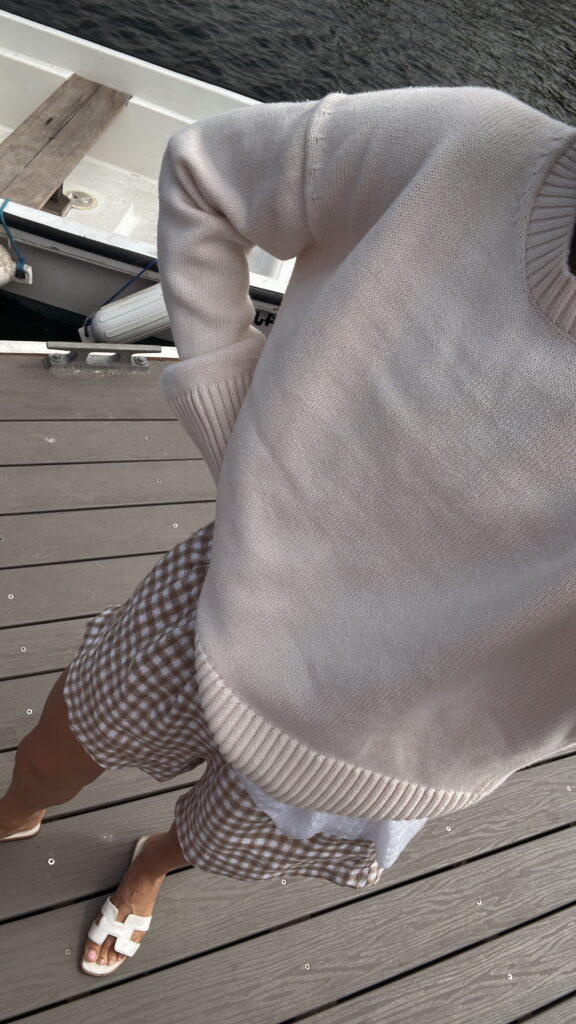 (Saturday lunch at the beach with friends… sweater, shorts)